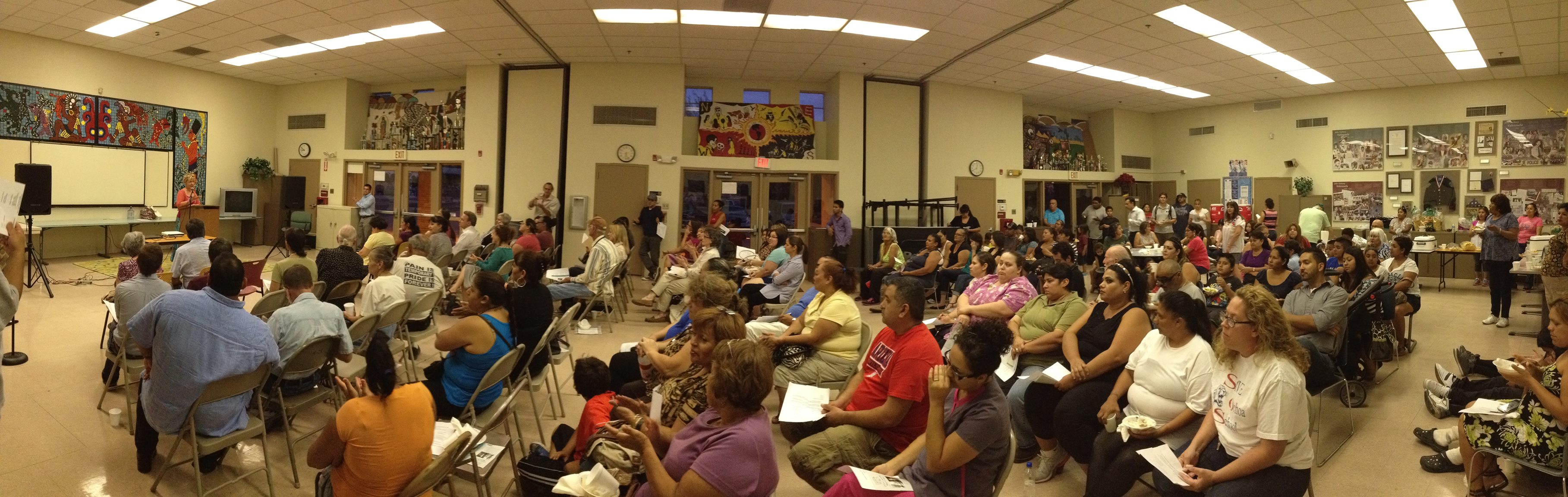 It is now six and people are beginning to show up, but I still worry. Morale has been at an all-time low among parents here at Ochoa and it has been difficult to encourage them to stay involved. I step outside for a breath of fresh air before we start. I’m suddenly filled with excitement and enthusiasm as I see cars lined up along-side the street in front of the John Valenzuela Youth center, and groups of parents congregating as they make their way towards the building.