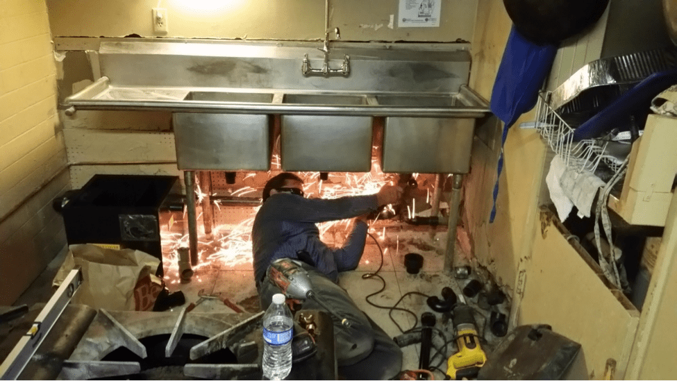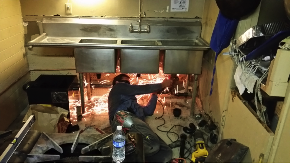 Another priority on Cesar’s list was the sink and drainage system. On first inspection, the drains were leaking, with pots and pans on the floor catching the leaks. Casa Maria knew they needed a grease trap and sanitary sink arrangement. We explored replacing the sink with a new, larger three compartment arrangement that would accommodate the large (20” in diameter) pots, but the room was so small, it would not accommodate a sink any larger than what they had. We elected to add a trap and a sanitary drain using the existing three compartment sink.