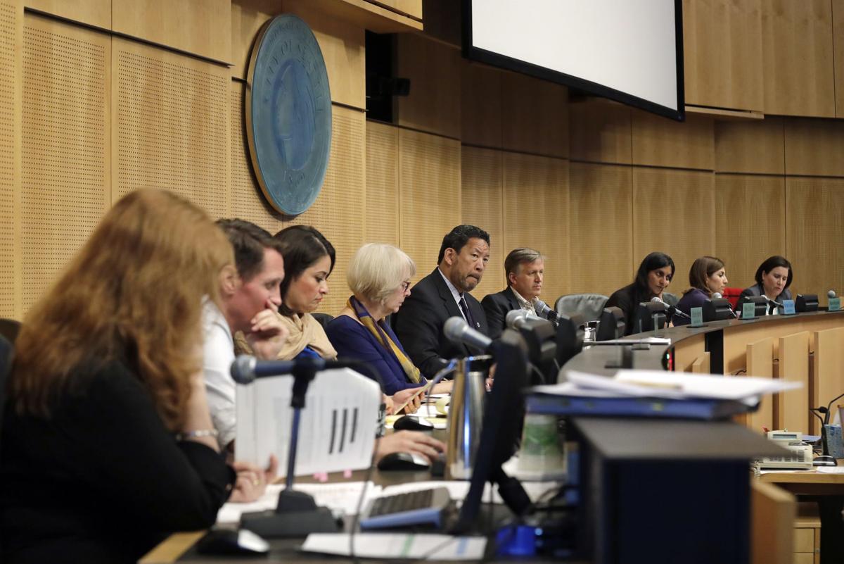 City Council Members look on as members of the public speak at a Seattle City Council meeting where the council was expected to vote on a “Head Tax” Monday, May 14, 2018 in Seattle. the council is to vote on a proposal to tax large businesses such as Amazon and Starbucks to fight homelessness. The plan would tax large businesses about $500 a year per worker to raise about $75 million a year for homeless services and affordable housing. (AP photo/Elaine Thompson)