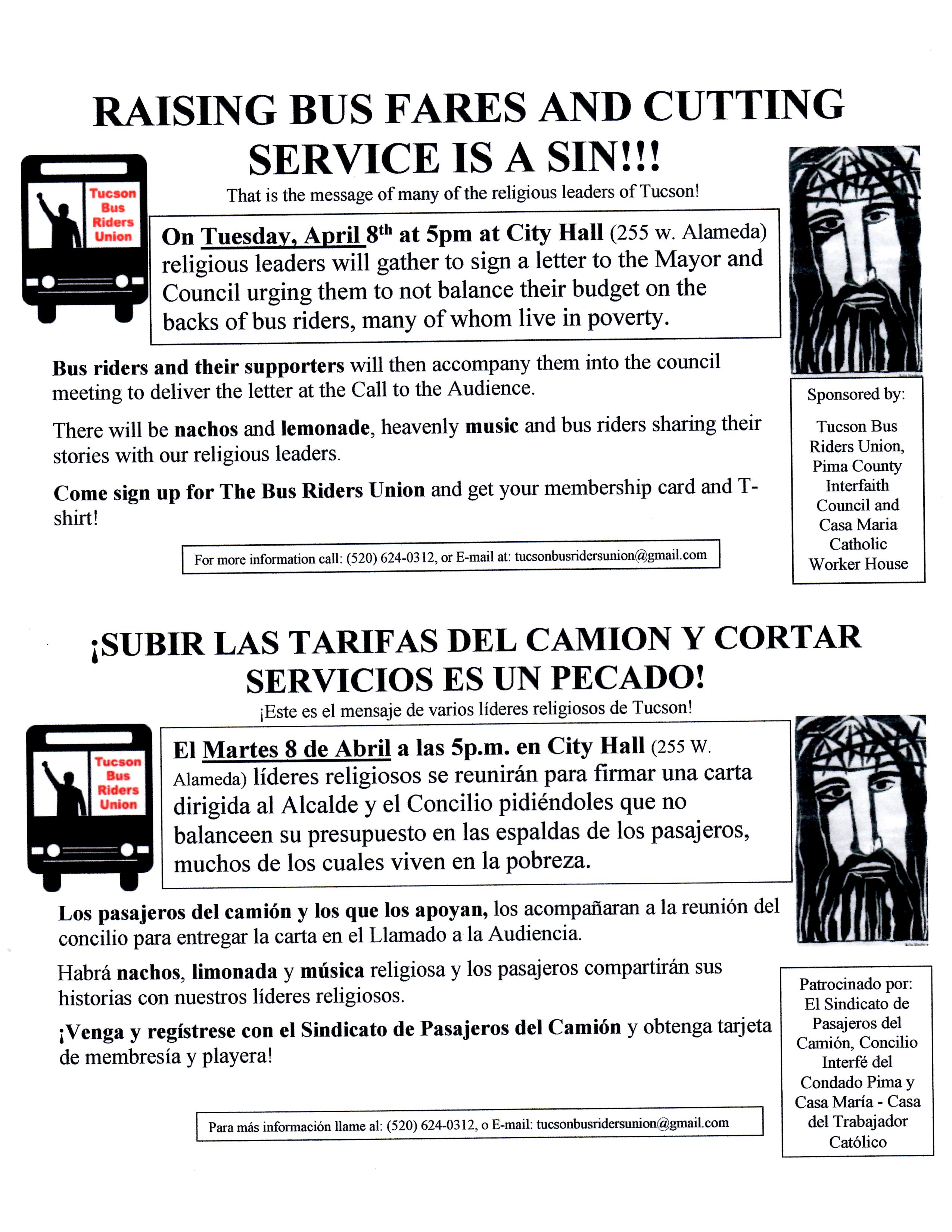 Now, you may be wondering how all of this applies to the Tucson Bus Riders Union. The fight to prevent the Tucson City Council from balancing the budget on the backs of poor people is integrally tied to Catholic social teaching. A fare increase will make it even harder for many families and people here in Tucson to make ends meet. Clearly, when someone must decide between paying for the bus to be able to get to work and properly feeding their children, that person’s dignity has been severely compromised. Plus, taking money from the poor to pay for services like the streetcar, which will serve a select and generally privileged sector of society, does harm to a just distribution of wealth and it is simply not fair.